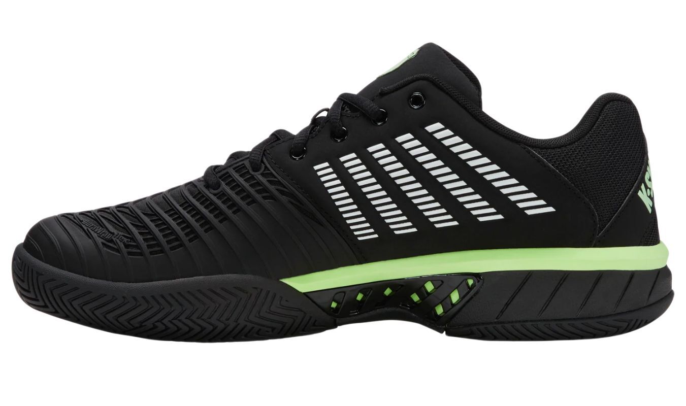 Мужские теннисные кроссовки K-Swiss Express Light 3 - black/soft neon green. Модель обеспечивает амортизацию, стабильность и быстроту передвижения по корту. Созданы для игроков, которые ищут легкую и маневренную обувь. Более широкий крой подойдет для высокого подъема или более полной стопы. Обновленный, легкий верх обеспечивает еще лучшую воздухопроницаемость и комфорт. В местах, наиболее подверженных истиранию, он дополнительно покрыт резиновым слоем. Защита DuraWrap в зонах повышенного износа увеличивает долговечность обуви. Промежуточная подошва обеспечивает максимальную амортизацию под стопами, динамику отскока и возврат энергии. Верхняя часть в средней части стопы обеспечивает дополнительную стабильность и защиту от нежелательного скручивания. Резиновая подошва Aosta 7.0 с универсальным протектором и системой non-marking обеспечивает отличное сцепление и хорошую долговечность на различных поверхностях.
