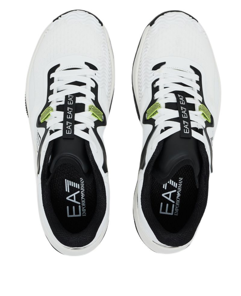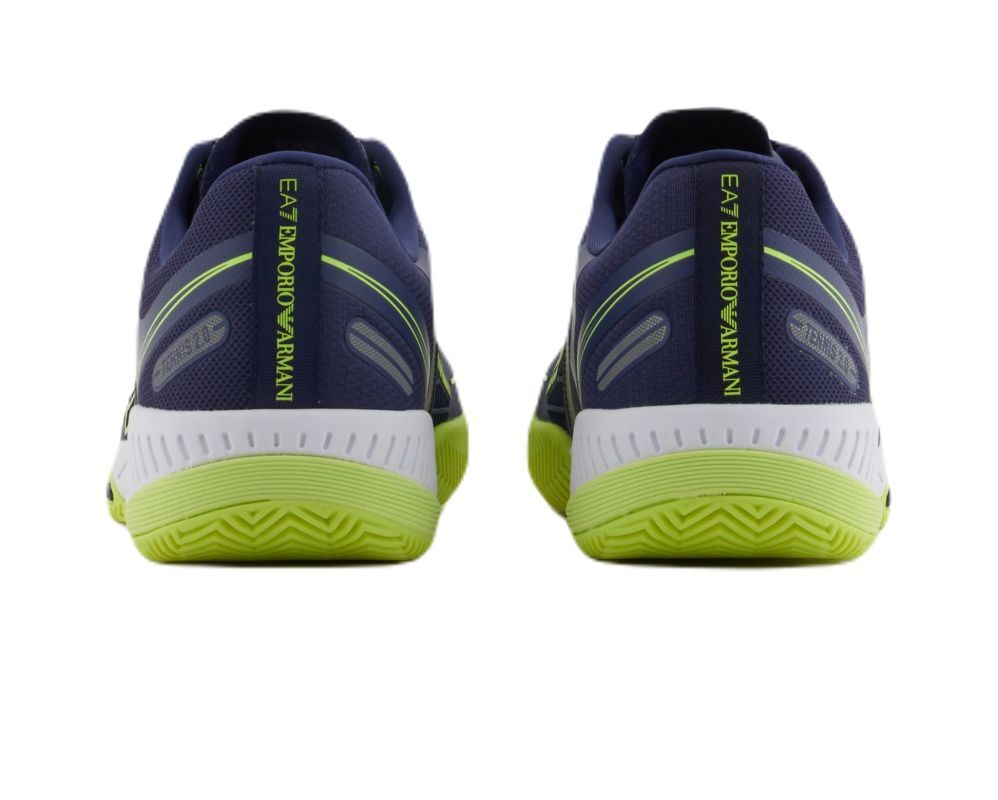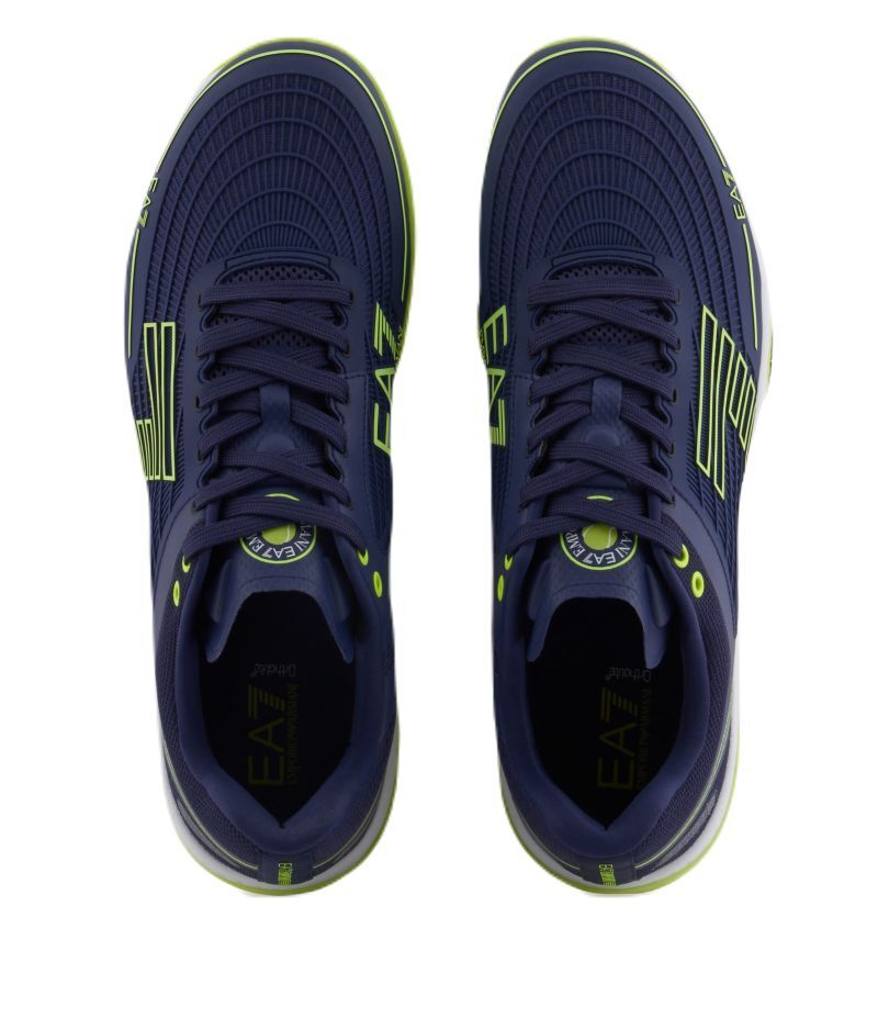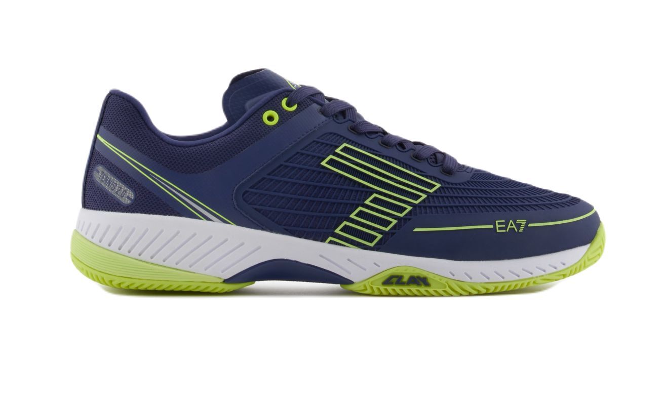 Удобная и стабильная обувь с элегантным внешним видом, который является результатом проекта итальянского дома моды EA7 Emporio Armani. В верхней части имеются многочисленные зоны с сетчатыми панелями, которые обеспечивают хорошую вентиляцию. Критические зоны, наиболее подверженные истиранию в области пятки и внутренней стороны свода стопы, были дополнительно усилены, что увеличивает прочность. Конструкция с частично интегрированным языком позволяет более надежно удерживать ногу в обуви, обеспечивая дополнительную поддержку. Средняя подошва из мягкой пены гарантирует хорошую амортизацию. Логотип Emporio Armani с внешней стороны добавляет стиль. Модель с подошвой в классическом стиле, предназначенная для игры на грунтовых кортах.