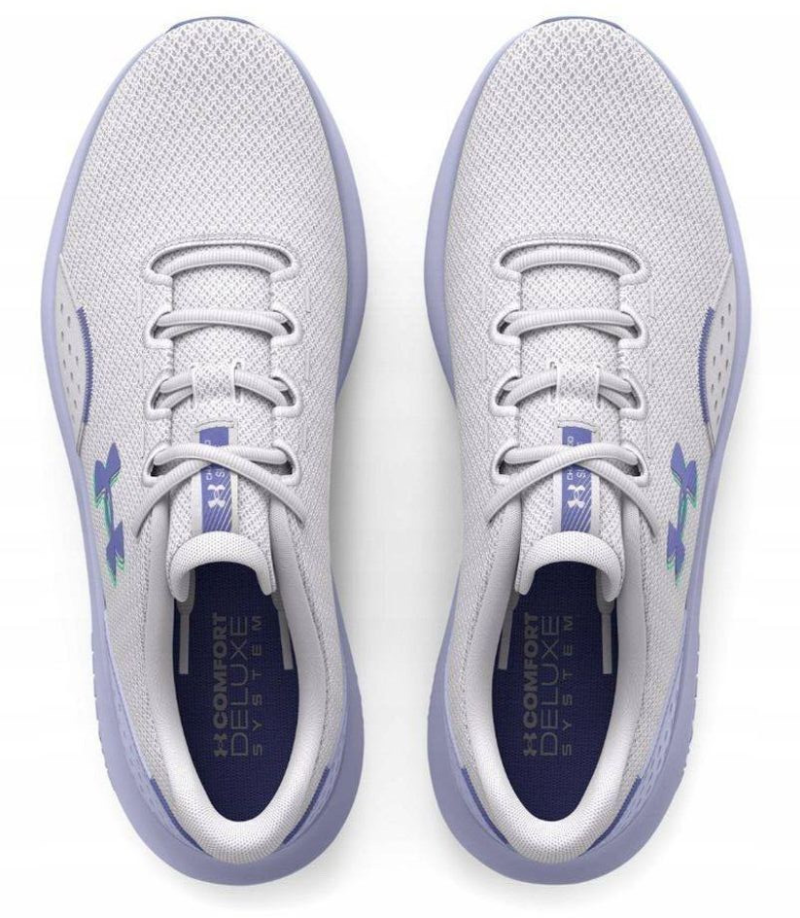 Женские кроссовки Under Armour Charged Surge 4. Комфортная обувь, идеально подходящая для бега, а также для повседневного использования. Легкий и гибкий сетчатый верх обеспечивает отличную воздухопроницаемость. Промежуточная подошва из мягкой, отзывчивой пены **Charged Cushioning** обеспечивает очень хорошую амортизацию. Стелька **Deluxe Comfort System** адаптируется к стопе, повышая комфорт ношения. Протектор обеспечивает сцепление на любом типе поверхности.