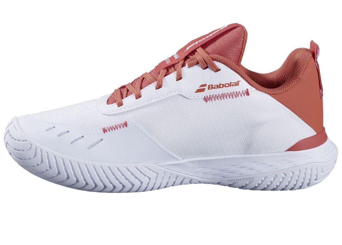 Женские теннисные кроссовки Babolat SFX Evo All Court - white/terra cotta. Легкая обувь, обеспечивающая максимальный уровень комфорта и сочетающая гибкость с соответствующей поддержкой. Широкий крой идеально подойдет для высокого подъема или более полной стопы. Верх из трикотажной сетки не ограничивает движения и обеспечивает хорошую вентиляцию. В критических зонах вокруг пальцев и пятки применены специальные синтетические усиления, повышающие долговечность и дополнительно стабилизирующие стопу. Использованы технологии: MICHELIN PERFORMANCE, ORTHOLITE, TOE BOX SHIELD. Универсальная подошва с системой non-marking (не оставляет следов на твердом корте) - для всех типов покрытий.