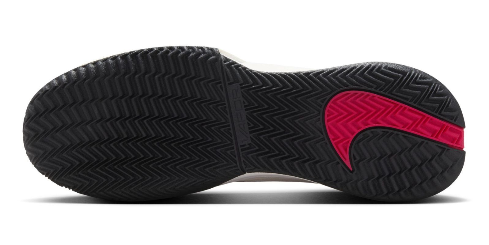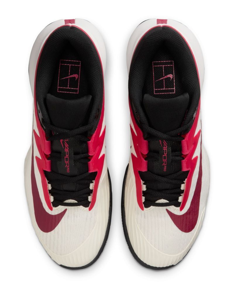 Женские теннисные кроссовки Nike Zoom Vapor Pro 3 Clay - pale ivory/rush pink/sail/team red. Третья версия культовой модели Vapor Pro содержит улучшения и инновации, внедренные инженерами Nike на основе предложений как профессиональных, так и любительских теннисистов. Сохранена высоко ценимая исключительная легкость обуви, которая позволяет быстро передвигаться по корту, одновременно улучшая уровень поддержки стопы при молниеносных поворотах и комфорт при ношении в течение всего дня. Конструкция верха из прочной сетки гарантирует отличную воздухопроницаемость. Эластичная резиновая окантовка вокруг носка и наиболее подверженной истиранию боковой, внутренней области увеличивает долговечность. Удаление резины из менее подверженных износу зон снижает вес обуви до минимума. Язычок с частично интегрированной внутренней носком структурой и полный ремешок в области средней части стопы, который позволяет сильнее затягивать шнурки, обеспечивают улучшенную посадку и еще более стабильно удерживают стопу при резких изменениях направления. Газовая подушка ZOOM AIR, расположенная в промежуточной подошве, обеспечивает очень хорошую амортизацию с отличной упругостью шага. Дополнительно уменьшение размера подушки улучшило гибкость и сцепление передней части обуви, что облегчает естественное сгибание при отталкивании и максимизирует динамику отскока. Специальный протектор подошвы CLAYBREAKER, разработанный с учетом карты давления и анализа областей, где скапливается больше всего глины, обеспечивает отличное сцепление на грунтовых кортах и ограничивает прилипание осадка.