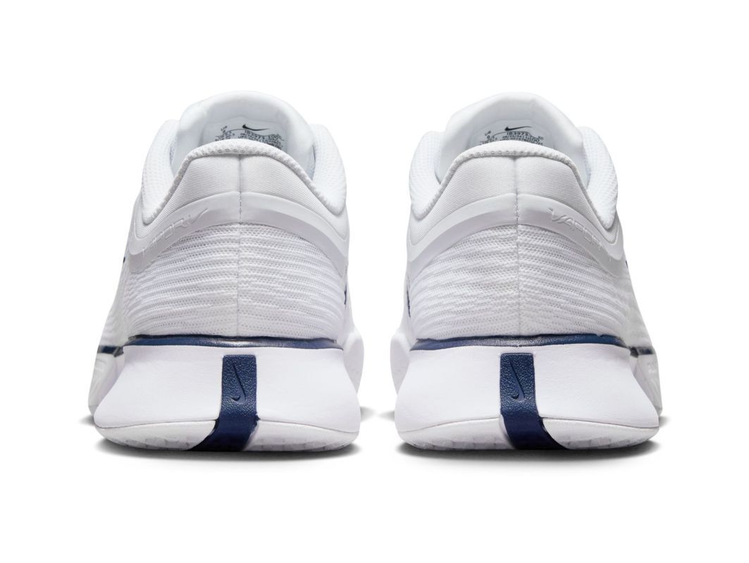 Женские теннисные кроссовки Nike Zoom Vapor Pro 3 HC Premium - white/midnight navy/blanc/marine minuit. Третья версия культовой модели Vapor Pro включает улучшения и инновации, разработанные инженерами Nike на основе предложений как профессиональных, так и любительских теннисистов. Сохранена высоко ценимая исключительная легкость обуви, позволяющая быстро передвигаться по корту, при этом улучшен уровень поддержки стопы при быстрых поворотах и комфорт при ношении в течение всего дня. Конструкция верха из прочной сетки гарантирует отличную воздухопроницаемость. Эластичная резиновая окантовка вокруг носка и наиболее подверженной истиранию боковой внутренней области увеличивает долговечность. Удаление резины из менее подверженных износу зон минимизирует вес обуви. Язычок с частично интегрированной внутренней носком структурой и полный ремешок в области средней части стопы, который позволяет сильнее затягивать шнурки, обеспечивают улучшенную посадку и еще более стабильно удерживают стопу при резких изменениях направления. Газовая подушка ZOOM AIR, расположенная в промежуточной подошве, обеспечивает очень хорошую амортизацию с отличной упругостью шага. Кроме того, уменьшение размера подушки улучшило гибкость и сцепление передней части обуви, что облегчает естественное сгибание при отталкивании и максимизирует динамику отскока. Благодаря профилю протектора, универсальная подошва не ограничивает возможности скольжения на различных поверхностях.